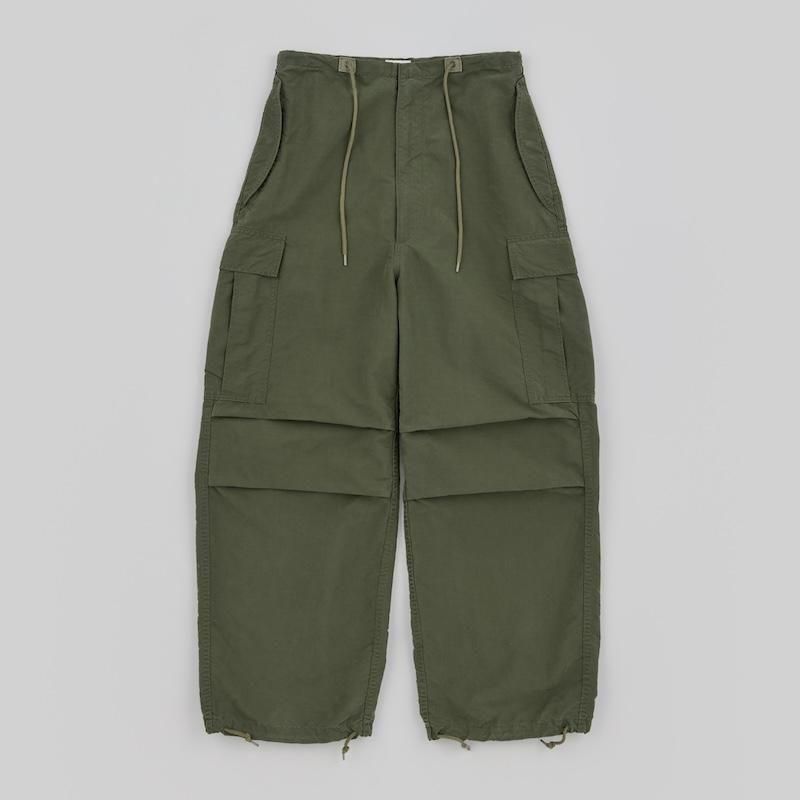 フィールドパンツの上からはくウインドブレーカーとして、1951年からアメリカ海兵隊で採用されていた、M-51ウインドオーバーパンツをサンプリング。生地は、超細番手のスビンコットンと210デニールのナイロンを高密度で交織したオリジナルのオックスフォード。スビンコットン特有の光沢やしなやかさと、ナイロンのハリ感がミックスされ、無骨さとエレガントが共存する独特の風合いに。オーバーパンツゆえの超ワイドシルエットを立体的に際立たせます。ウエストと裾のドローコードを絞ってフォルムの変化が楽しめます。