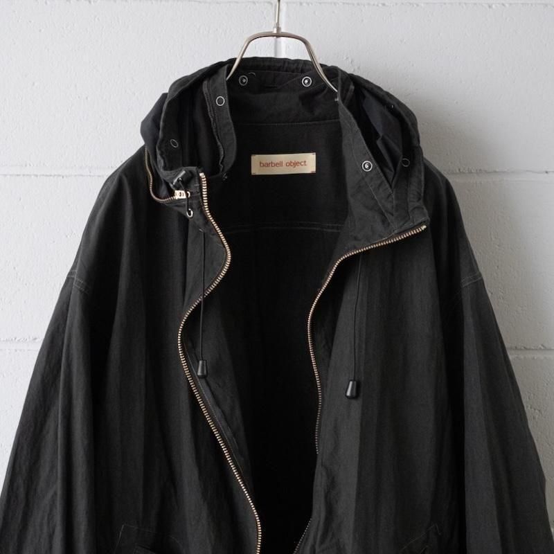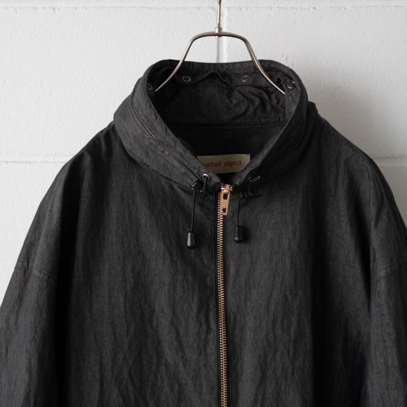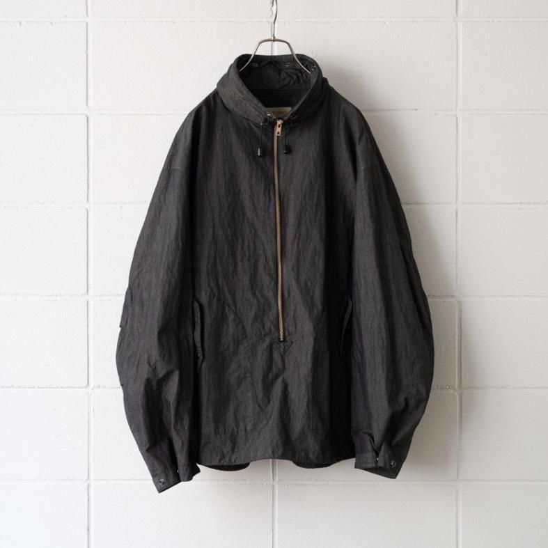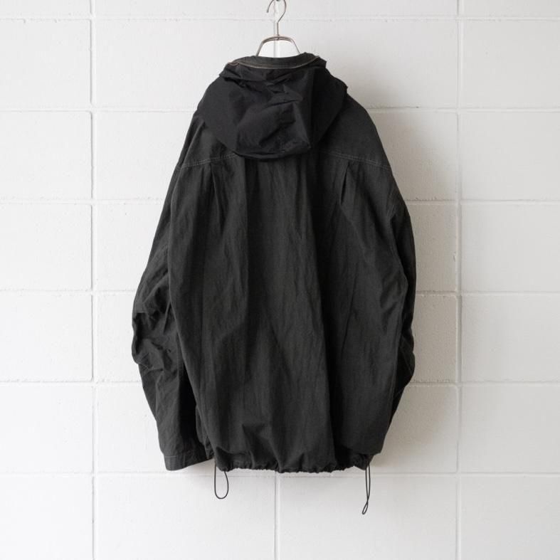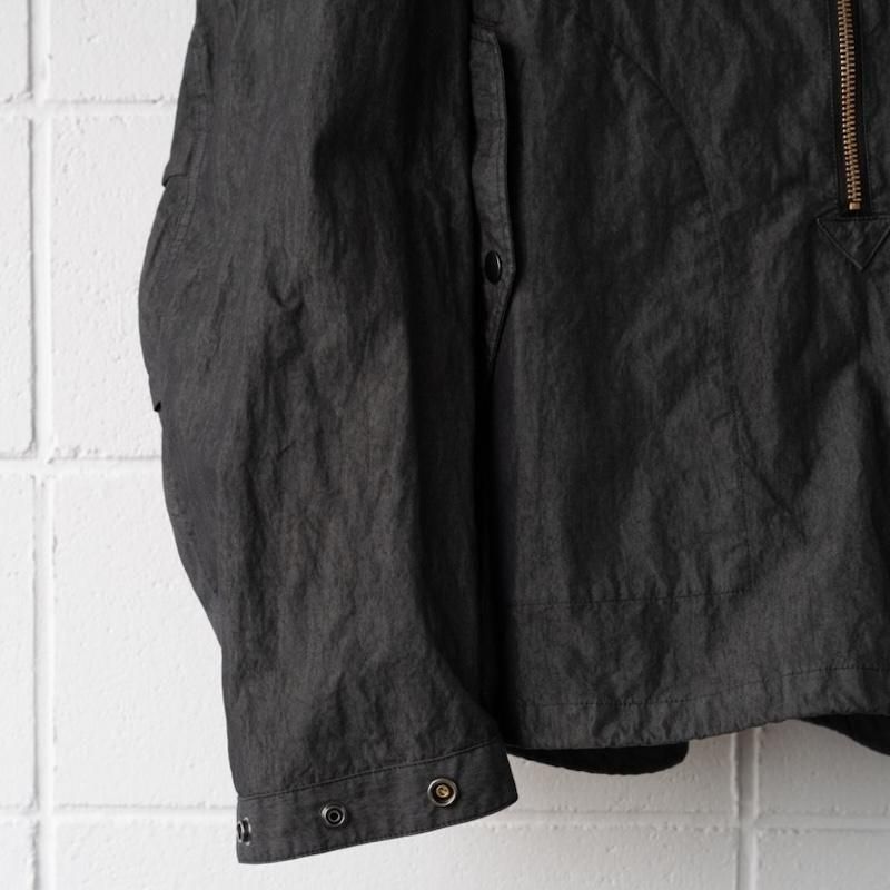 生地段階でブラックに染め、コットンナイロンの交織の組織ですので、繊維それぞれを汚染させ、製品後にブラックに再 度染め、汚染に汚染を重ね作ってますので独特な生地感に仕上がっています。ミリタリー要素のデザイン性とスポーツウェアの設計を参考にデザインされた1着です。