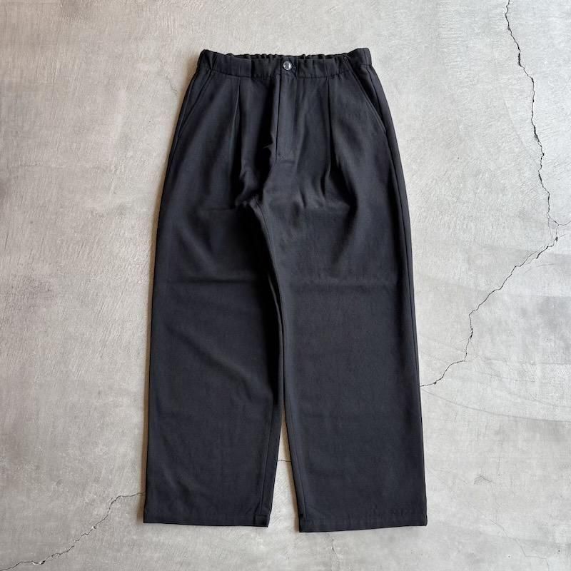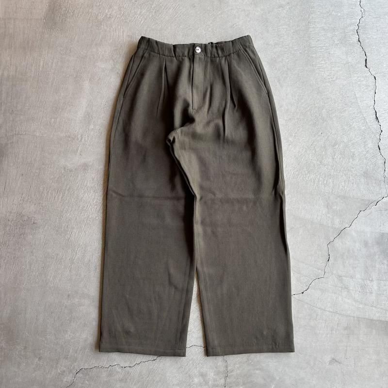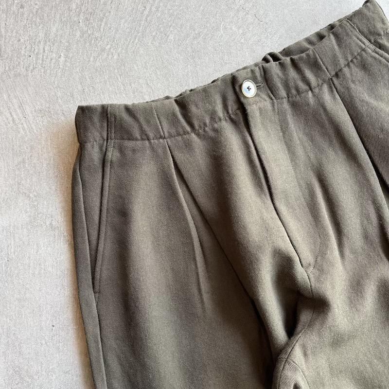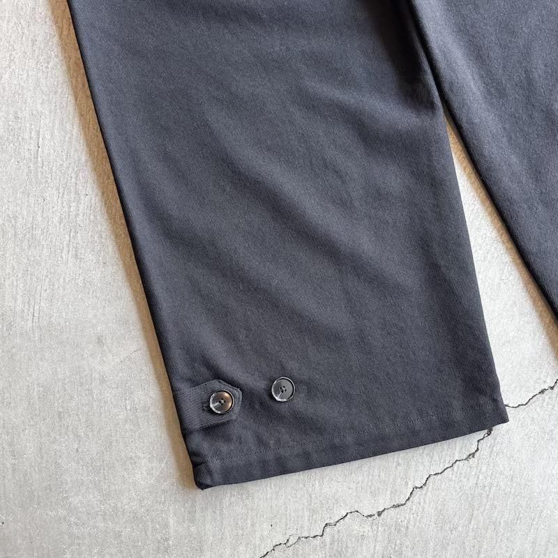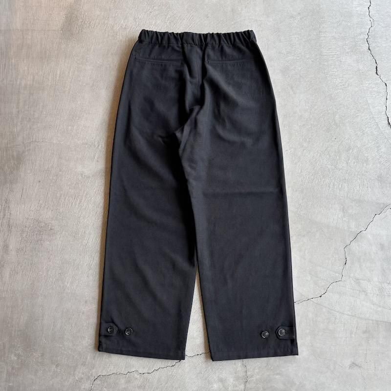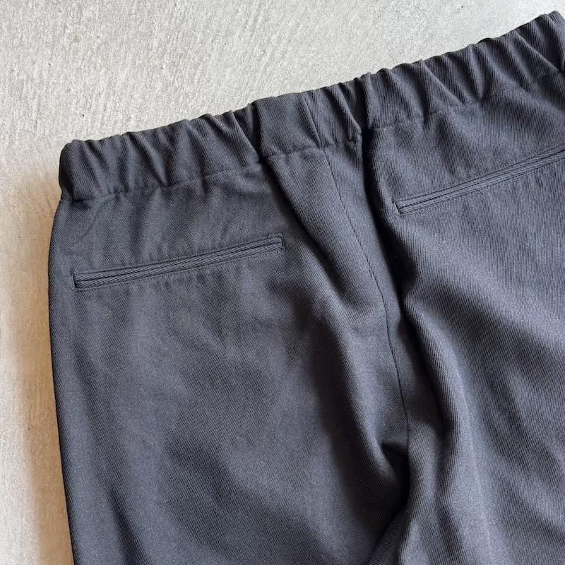 サージの彫りが深く、凹凸感がはっきりとわかる風合いのウールサージに洗いをかけソフトな風合いながら、ハリ感が出ていて腰がある素材です。定番的に展開し、都度シルエットをアップデートしている、ワイドシルエットのパンツです。裾にアジャストボタンがありシルエットの変化も楽しんでいただけます。