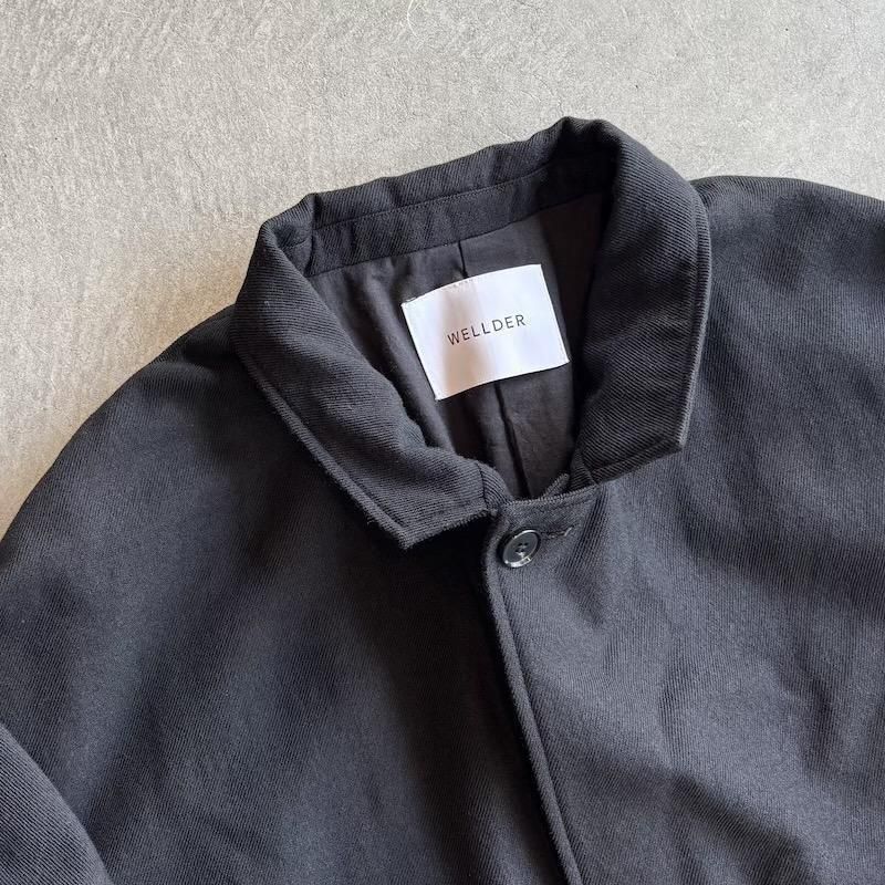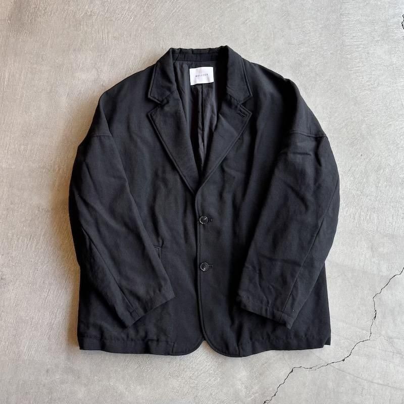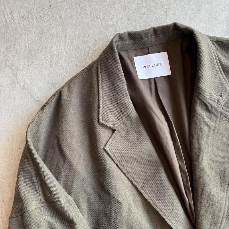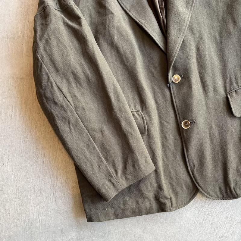 サージの彫りが深く、凹凸感がはっきりとわかる風合いのウールサージに洗いをかけソフトな風合いながら、ハリ感が出ていて腰がある素材です。極端に肩を落とし完全なボクシーシルエットに仕上げています。