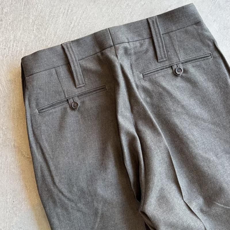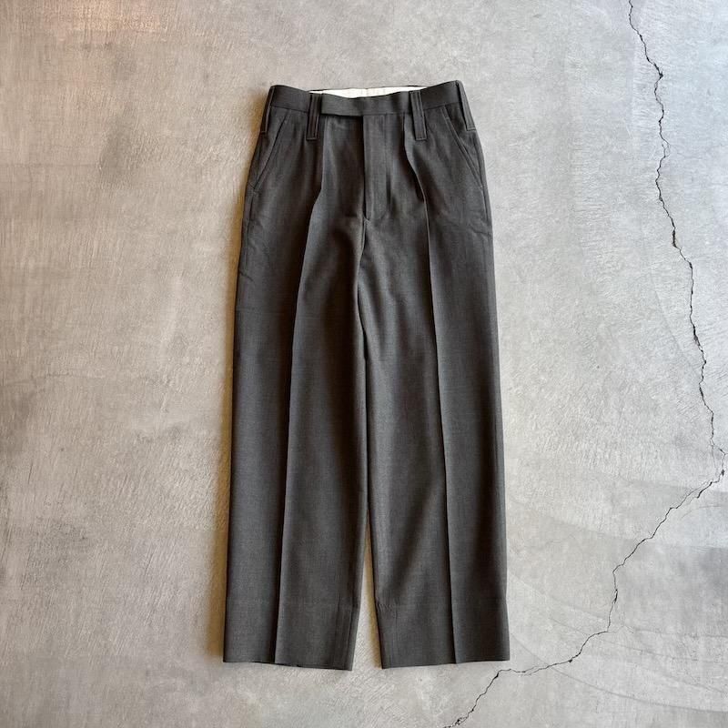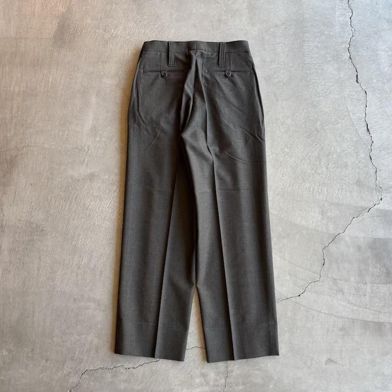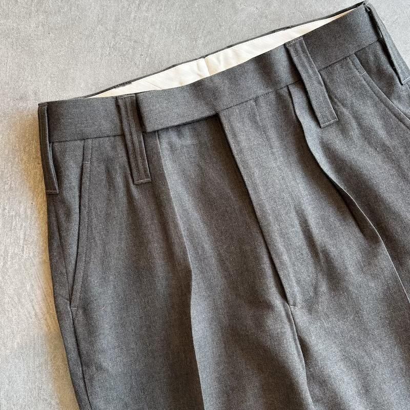 50年代フランス軍の名作のパターンにならい、股上とわたりヒップ周りのボリュームをやや大きめにとり、裾にかけて緩やかにテイパードする1タックトラウザーズ。程よいボリューム感がありつつ、フルレングスで着用できるスラックスをイメージしています。ディテールには英国の軍士官が着用していたトラウザーズを踏襲し、太く長いベルトループやループ付きのバックポケットを採用しています。前たてにはLampo社のクラシックなスリムファスナーを採用しました。ブランドロゴ入りのオリジナルマーベルト仕様です。世界各国のミリタリーを解体、考察しつつ上質な素材を用いた生地作りを行う国内機屋による48番双糸の高密度ウールサージ生地。織り機にかけられる限界まで糸を打ち込んだのち、オフスケールしてワッシャー加工を施すことで立体感がありつつドライな質感に仕上げています。