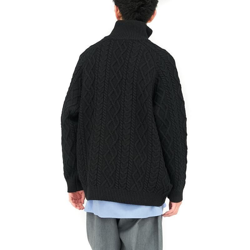 伝統的なアラン編みのフィッシャーマンセーターを現代的にアップデート。伸縮性や形態安定性に優れたSOLOTEX糸にシェットランドウールをカバーリングしたハイブリットな一着。
