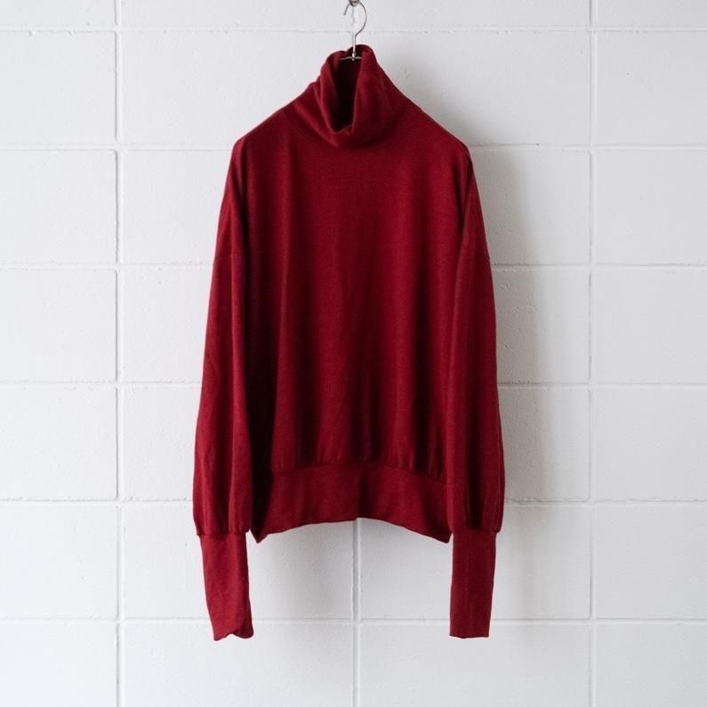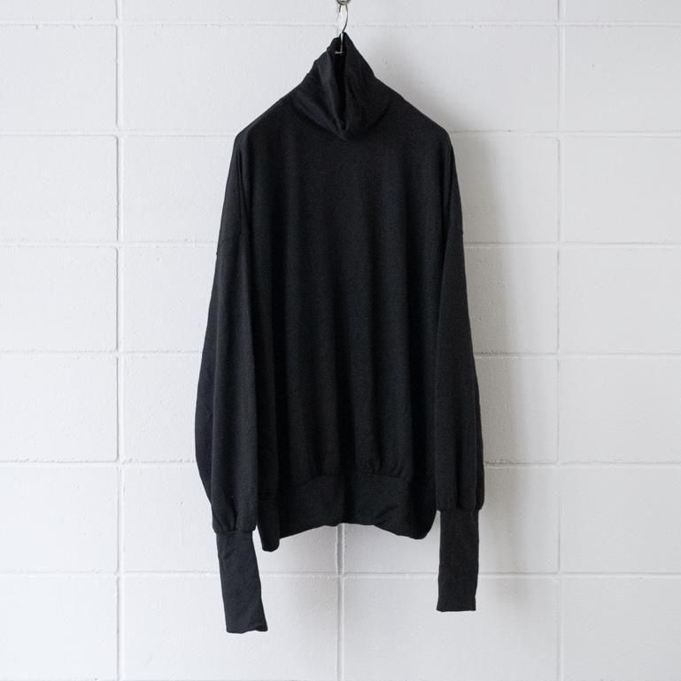 ウール天竺で製作したタートルネックになります。程良い首の溜まり具合と、ややゆったりしたシルエットに仕上げています。袖リブにはフィンガーホール付き。
