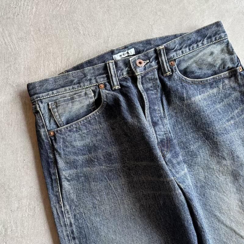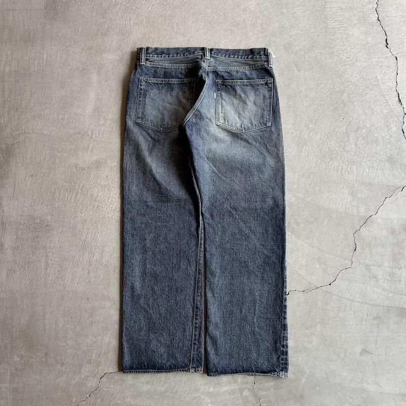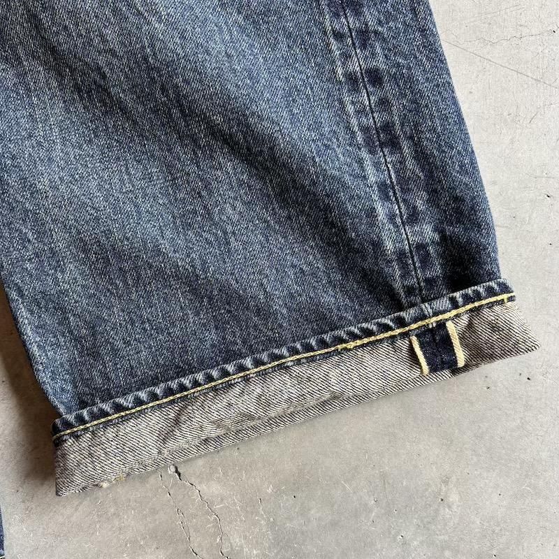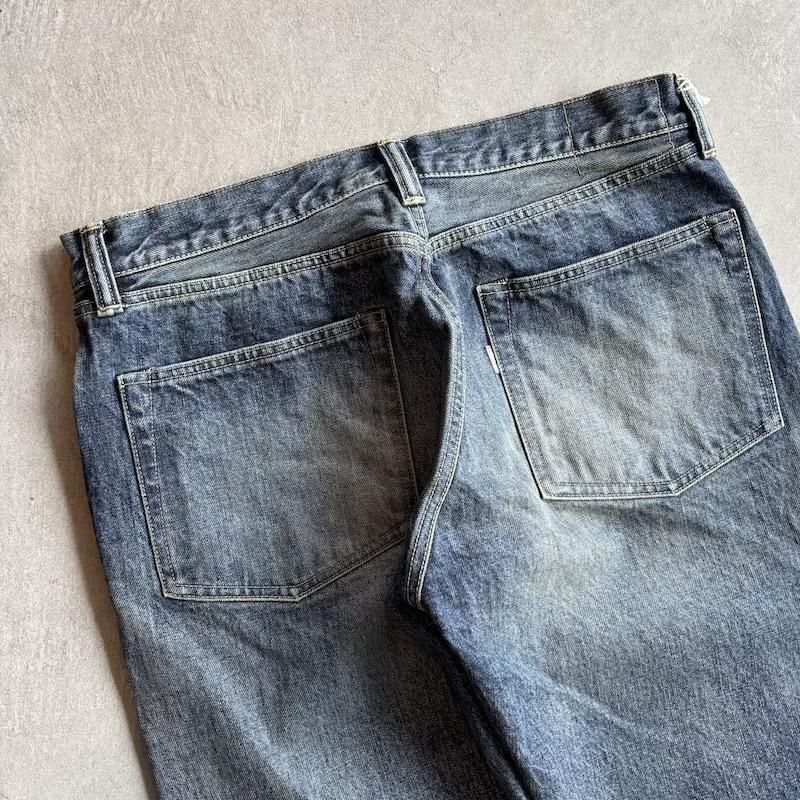 ヴィンテージの名作であ大戦ジーンズをモチーフにした1本。生地はへビーオンスの生機デニム。前たてには鉄製の月桂樹ボタンとドーナツボタンによるボタンフライを採用しました。バックポケットの隠しリベット仕様やイエロー主体のステッチ、アソートのスレキなど時代考証によるディテールを盛り込んでおります。元々の大戦モデルらしいシルエットを忠実にトレースしつつ、細かな寸法に微調整を入れています。