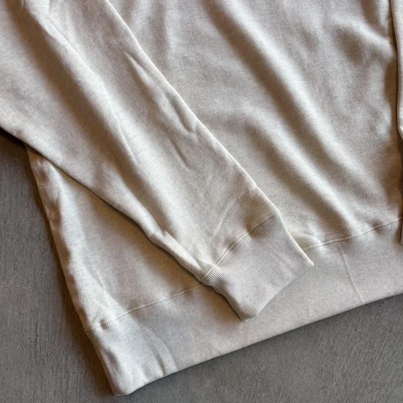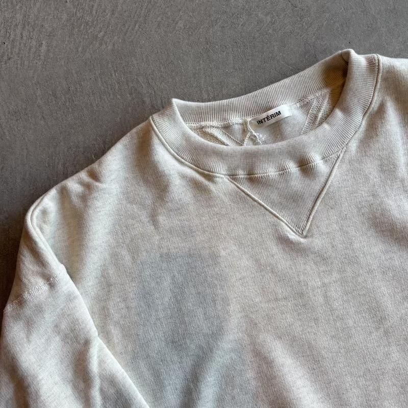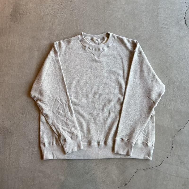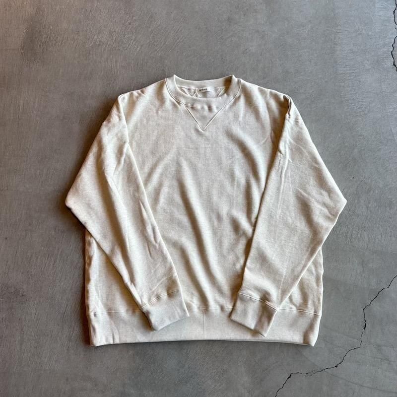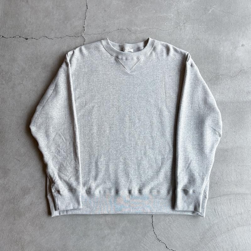物理学者アルベルトアインシュタインが晩年好んで着用していたスウェットから着想した両Vのスウェットシャツ。着古して着丈が少々縮んだスウェットのバランス感をイメージし、特に身幅をたっぷりととった他、裾や袖リブを長めに、ネックリブをやや太めに設定しております。国内のメリヤス専業工場で、フラットシーマとオーバーロックを使い分けながら縫製しております。