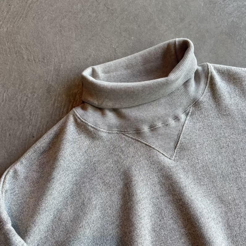 ハイネックスウェットシャツの原型は、1920年代頃までスポーツシーンで着用されていたウール製ハイネックセーターにあります。1930年代には、より吸水性に優れたコットン素材で代用されるようになり、日常にも取り入れやすいスウェットとして発展しました。本作はその当時のディテールを忠実に再現しつつ、現代的にアップデートした1着。前後の両Vガゼットや古い縫製仕様、倒し方向など細部までヴィンテージの雰囲気を継承。さらにハイネックに合わせて袖口と裾リブも長めに設定し、クラシックな中にアクセントを加えています。