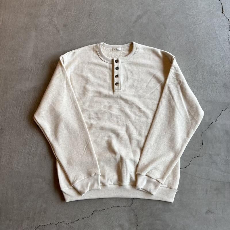 イギリスの伝統的なハイゲージニットを象徴する老舗ニッターが手掛けてきたウエアからインスピレーションを得て作成した、ヘンリーネック仕様の長袖スウェット。上質な素材使いとクラシックなディテールを踏襲しながら、現代的なリラックス感をプラスしています。生地の贅沢さや風合いをしっかり堪能できるよう身幅や肩幅にはゆとりを持たせ、程よく抜け感のあるシルエットに仕上げました。前たてには、一般的にはカットソーには使用することのない現在では入手が難しくなりつつある希少な本水牛ボタンを贅沢に使用しました。