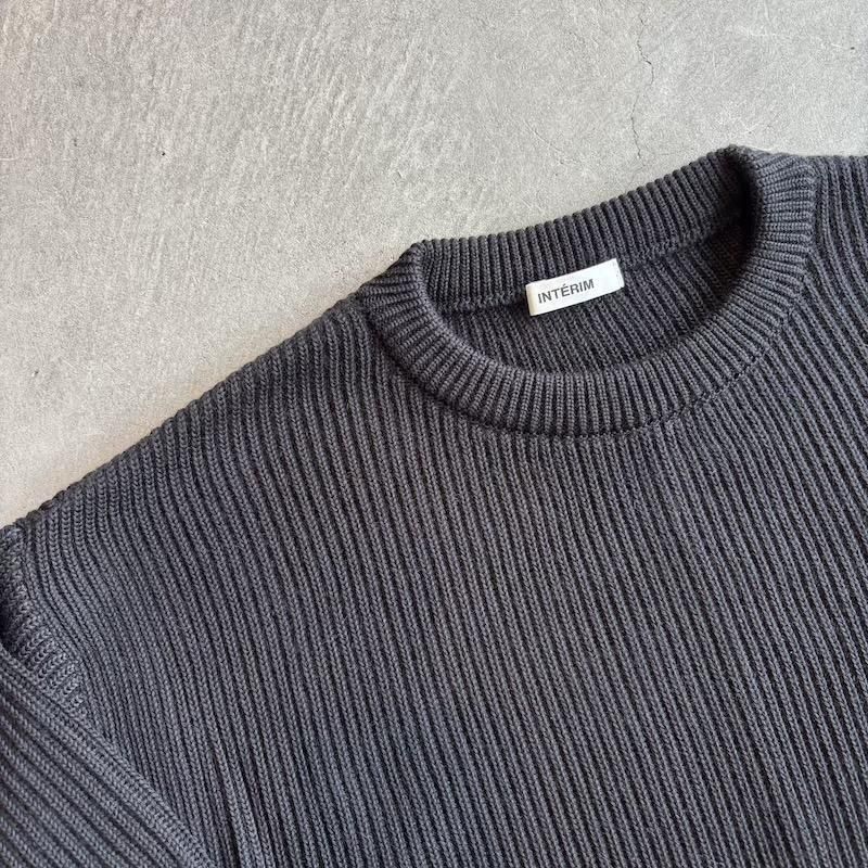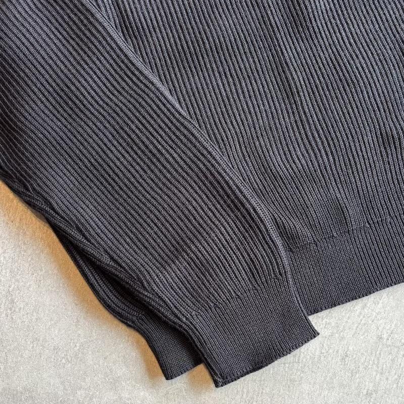 本来であればスーパーハイゲージ用に使われる極めて細番手の糸を超多本取りにして製作したクルーネックセーター。これだけの細番手を超多本取りにするだけでも非常に難易度が高い中、熟練のニッターの手によって両畦での成型編みにトライしました。フォルムは18世紀から続く英国の老舗ニットウェアカンパニーがフランスを代表する某企業と協業し、アスリート向けのアイテムとして生産したニットをモチーフにしました。当時の物としては希少な大きめのサイズの個体をサンプリングしています。