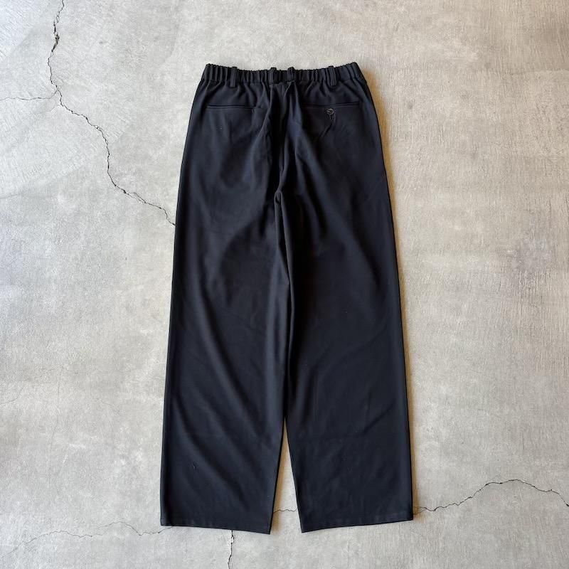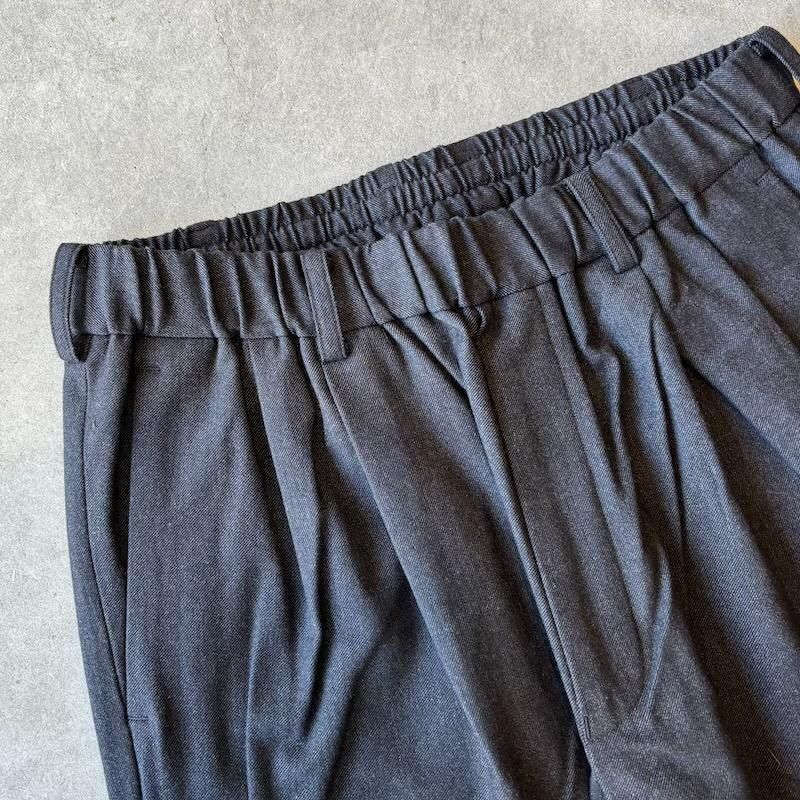 ポリエステルとヴィスコースを用いて作成されたストレッチ素材のイージースラックス。生地の表面は微細な起毛を施すことで肌あたりも滑らかでカシミアを思わせるような履き心地が特徴になります。