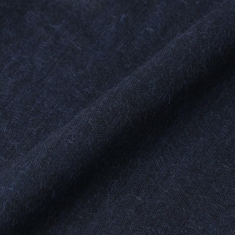 24Gのジャガード機で最大限に度詰で編み立てました。タイプライターという織物の高密度平織組織を実現。ストレッチ性が高く一度着ると止められない着心地。モヘアのハリ感による、しわなどの形態変化も少なく、イージーケア性。そして光沢感と程よい毛羽感が特徴になります。モヘアの中でも高級原料とされるなキッドモヘアとSuper100’s高級ウール原料をmixした別注糸を100%使用。毛羽を飛ばす工程を糸と生地状態で入れることで着用による劣化を抑えております。また最終工程で、あえて生地に熱を加え抑えることで、光沢感と膨らみを抑えて仕上げております。独特のハリ感、光沢感、柔らかさ、もちろん吸湿性や保温性もあるラグジュアリー素材。原料のポテンシャルを最大限に引き出しております。