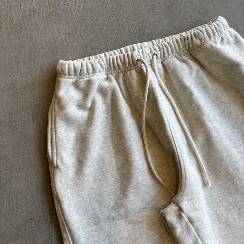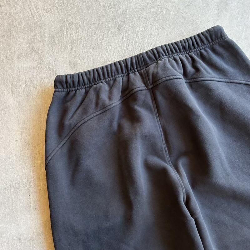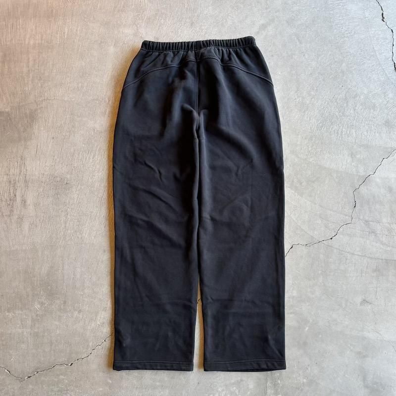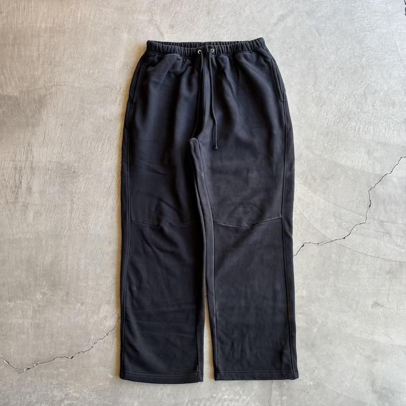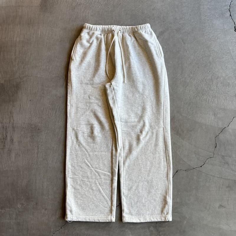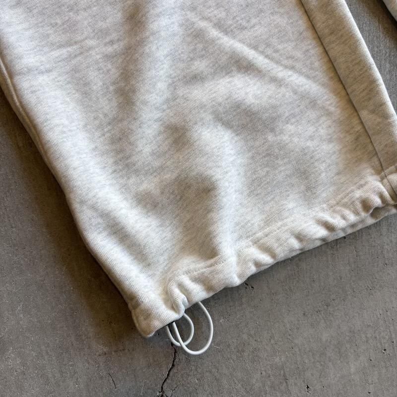 ソフトで程よいボリューム感のある綿、化繊が混紡した裏毛を使用しています。ワンウォッシュ加工を施し、毛羽立たせて愛着のある風合いにしました。程よいゆとりがあるストレートシルエットです。裾のドローコードで裾幅を調整できます。