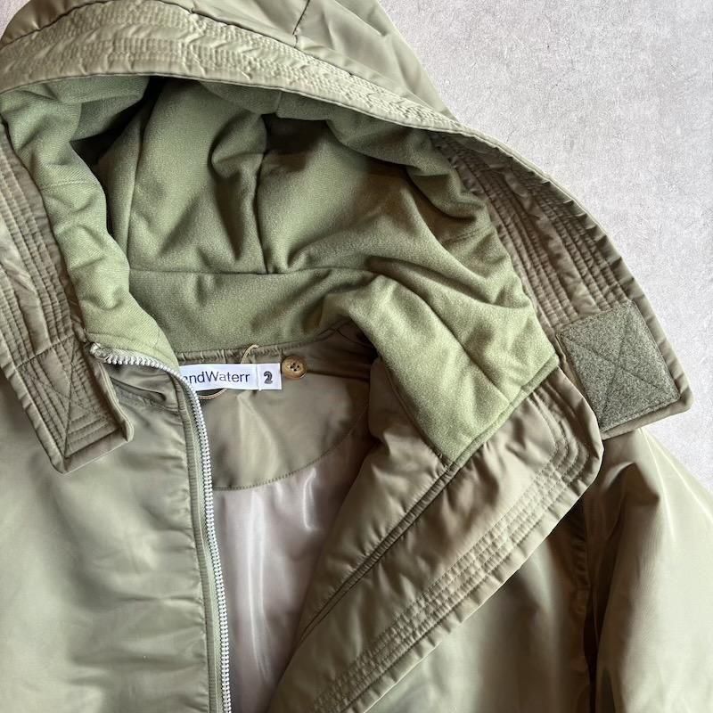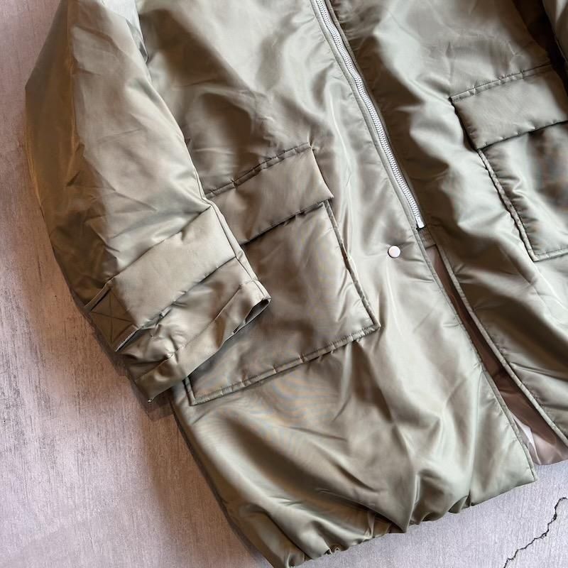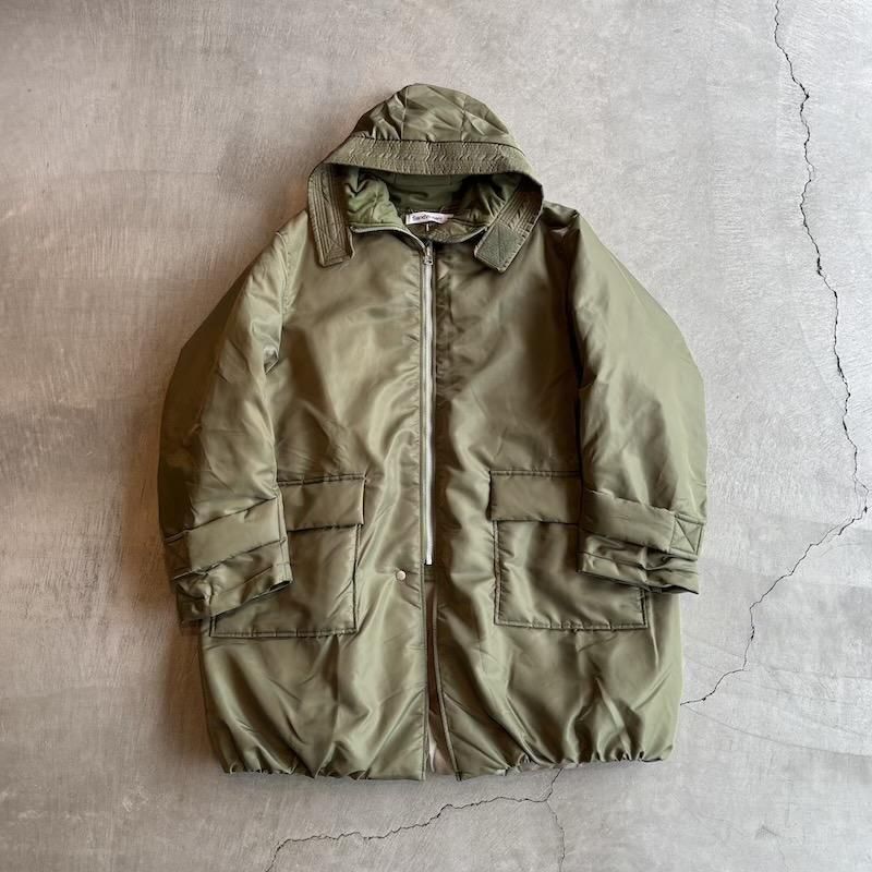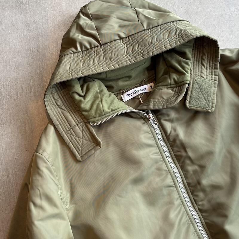 ミリタリーで採用されている肉厚でタフなナイロンサテン生地を使用。程よい光沢感とヴィンテージライクな風合いが特徴的です。スコープ状のフードと見頃、袖のシルエットがミリタリーウェアをインスパイアしたデザインになります。再生繊維から織られている裏地は制電性、ストレッチ性に優れています。ワンウォッシュ加工を施しております。