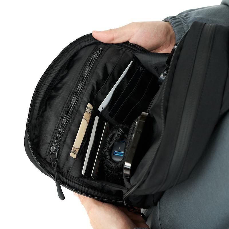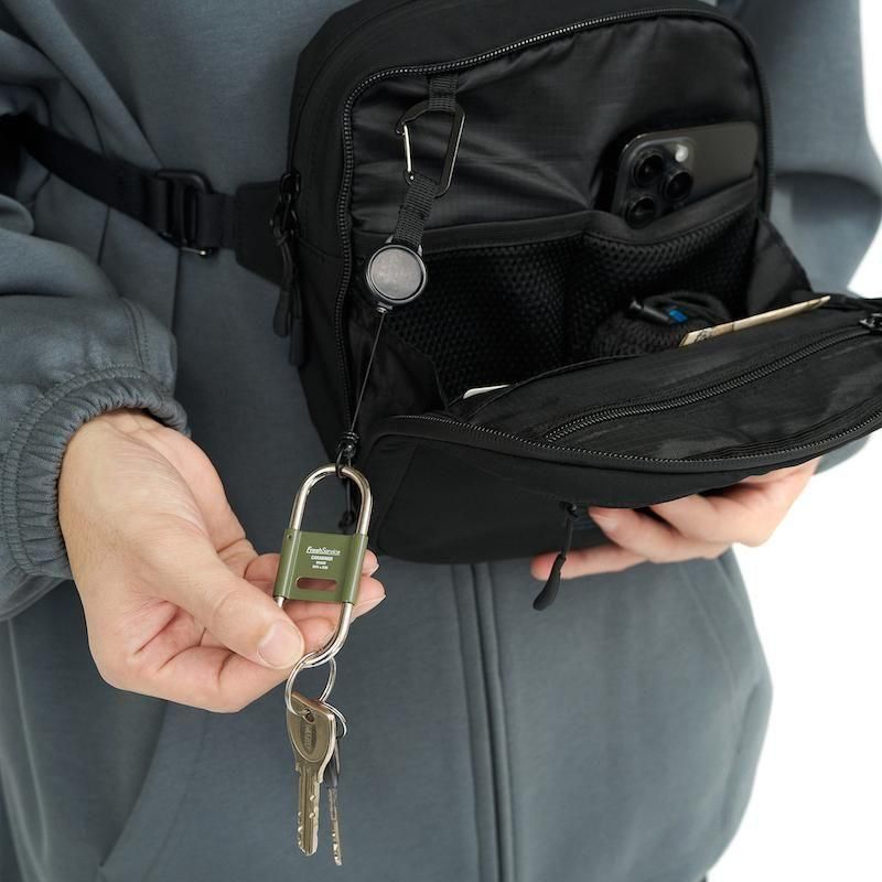 旅をテーマにしたFreshTourServiceからリリースされる、多機能なポケットを搭載したスリングバック。体に斜め掛けして使用するデザインで、パスポート、携帯電話、キー、財布の機能があり、貴重品は全て収納する事が出来る。2つのメインポケットがあり、外側ポケット口は大きく開いても操作しやすいところで止まるようにマチがついており作業しやすいように設計。