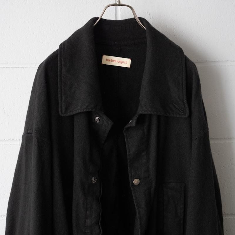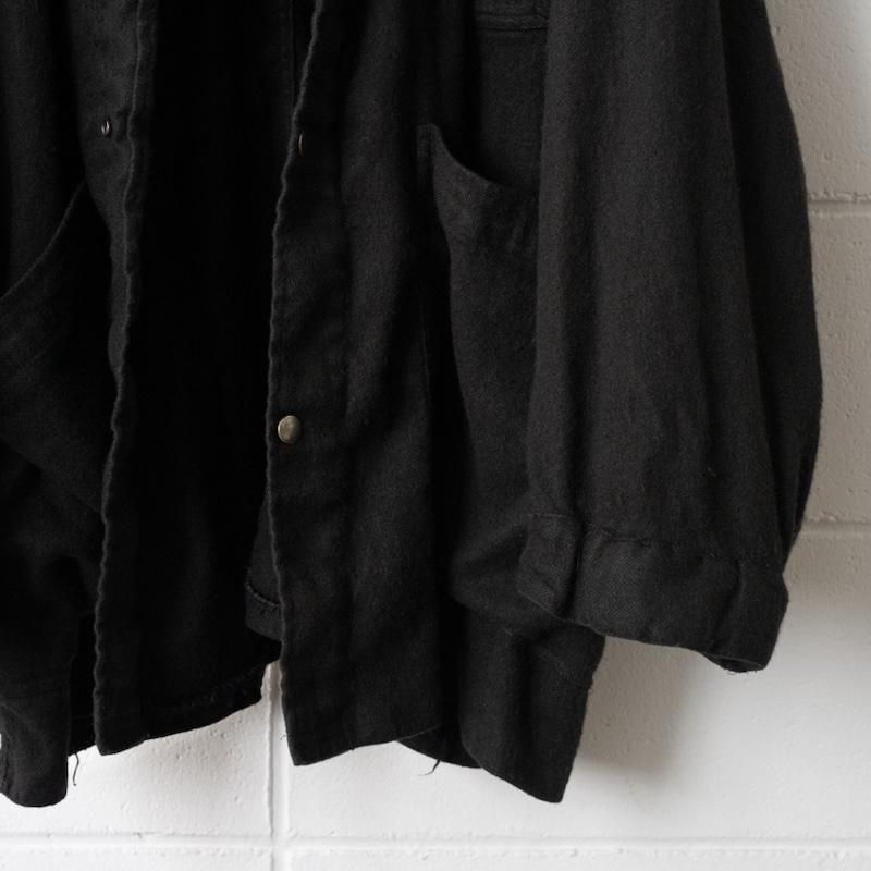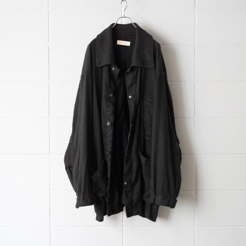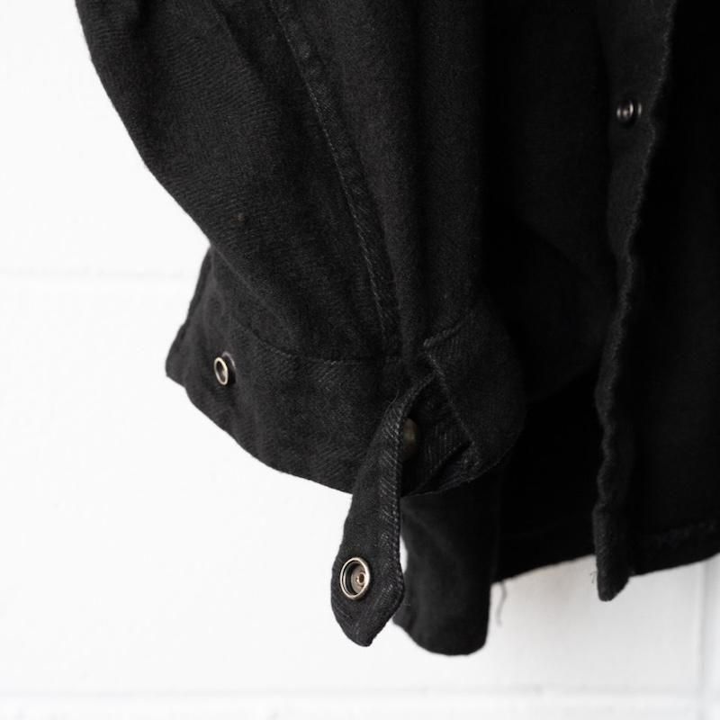 flowerとは、”花が咲く”。 いくつかのパターンがあるのですが、加工B品が出た際にその言葉を使ってます。世間的にB品とする環境を意図的に狙って製作しました。 起毛のように見えますが、経年で無数の毛玉やカシミヤが噴き出してくる、藻を張ったような素 材です。カシミヤを先染めの黒糸でセットし、染める事でblackを作り出しています。