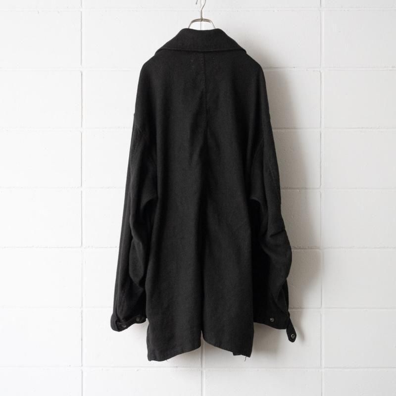 前下がりを大胆に下ろし、ハンドウォーマーやパッチPKもバランスを下げつつ、シン プルながらもバランスのユニークなデザインにしたコートになります。