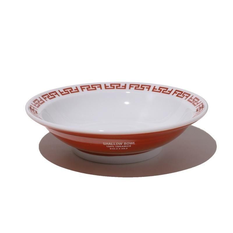 クラシックな雷文を縁に配した、美濃焼の浅型ラージボウル。手作業で仕上げられているため、釉薬のムラや刷毛跡、色合いの個体差が一点一点に異なる表情を生み出し、器としての味わいを引き立てる。内側には「FRESH RAMEN SERVICE」のロゴをあしらい、懐かしさとユニークさが同居する佇まいに。広がりのあるフォルムと安定感のある高台が特徴。サイズはφ22cm × H6cm。